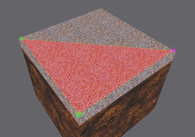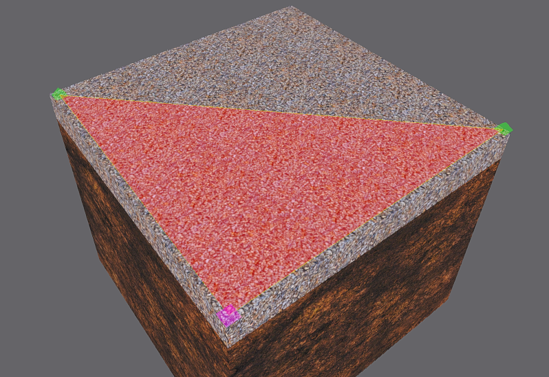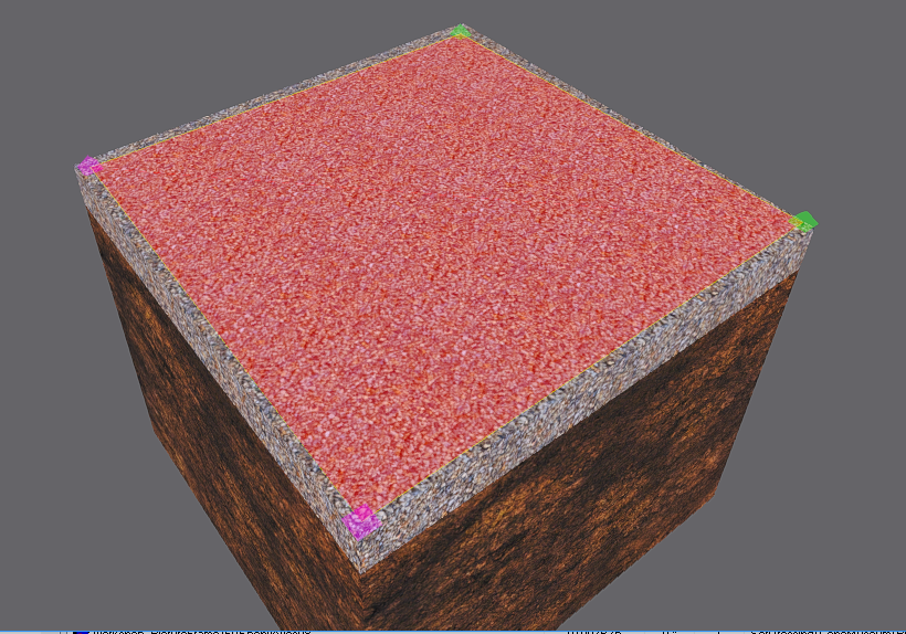| Dans l'image ci-dessus, on voit un bloc représentant un bloc de terre avec une couche de graviers, juste au-dessus on voit une surface rouge transparente, c'est la navmesh. Dans cet exemple la navmesh a déjà été créée. |