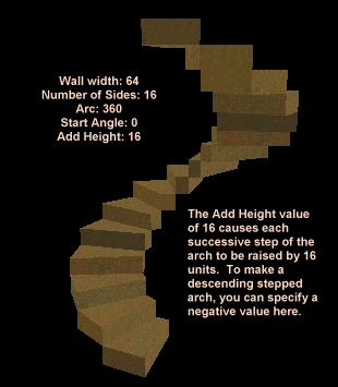 Ajouer Hauteur, ceci permet de créer une arche en escalier (escalier circulaire). Une valeur positive pour des marche vers le haut, et négative pour aller vers le bas. Les escaliers grimpent ou descendent dans le sens des aiguilles d'une montre :