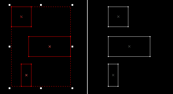Les objets peuvent être alignés sur le côté gauche, droit, en haut, en bas. L'objet qui est le plus éloigné dans la direction d'alignement reste fixe, et tous les autres vont aller s'aligner avec le côté de cet objet. Bien sûr, la direction d'alignement des objets dépend de la vue 2D active.