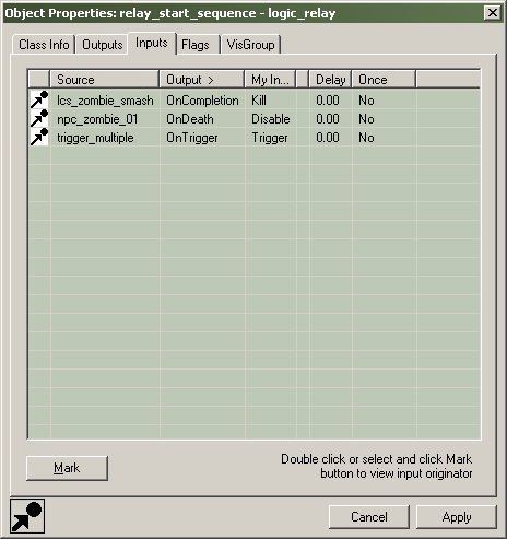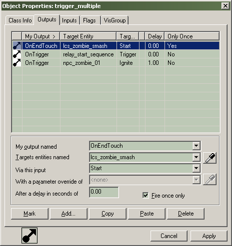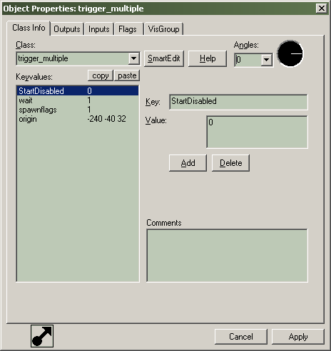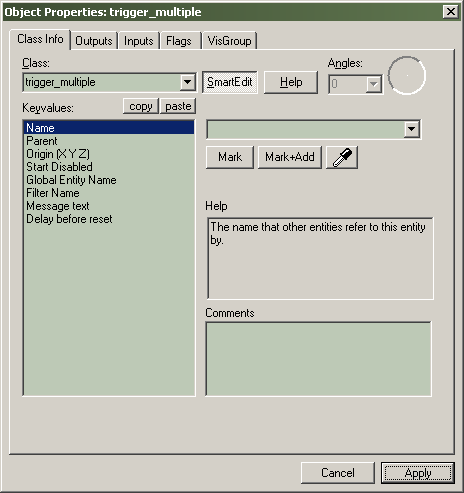 Ce bouton va ouvrir la boite de dialogue d'aide pour la classe d'entité sélectionnée. On y trouve la description de l'entité, ces kyvalues, et aussi tous les Inputs(entrées) et Outputs(sorties).