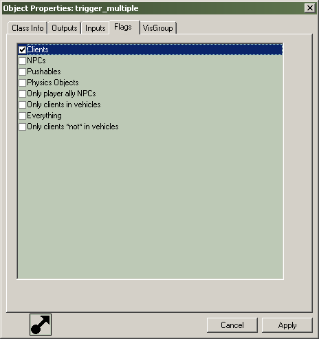 Vous trouverez la liste de tous les flags disponibles pour un entité. Cette section est seulement disponible lorsqu'on modifie les propriétés des entités. Un flag vous permet de commuter on ou off une fonction spécifique de l'entité. Si plus d'une entité sont sélectionées, quelques case à cocher vont apparaître en grisé. Cela signifie que le flag est activé seulement pour quelques unes des entités. Plus d'informations sur l'usage des flags pour les entités spécifiques dans le guide des entités Entity Guide.