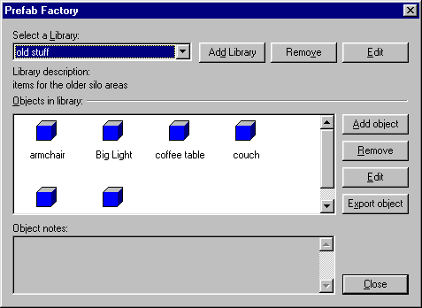 Comme la boite de dialogue Entity Report vous permet de gérer les entités, la Prefab Factory vous permet de facilement gérer votre collection de librairie de préfabriqués prefab libraries, en incluant, ajoutant et supprimant des objets et des préfabs existants.