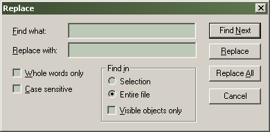 Definit la zone de recherchethe. Lorsque Selection est choisit, seuls les objets sélectionés seront parcourrus et modifiés. Entire file fait des changement à toutes les correspondance dans la map, indépendemment de ce qui est sélectionné. Avec Visible objects only activé, seuls les objets qui sont visibles seront changés -- les objets dans les Visgroup qui sont cachés ne seront pas changés.