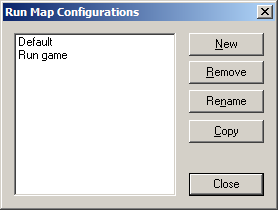 En cliquant le bouton Edit on ouvre la boite de dialogue Run Map Configurations. Ajoutez une nouvelle configuration en pressant le bouton New. Supprimez une configuration avec le bouton Remove. Changez le nom d'une configuration avec le bouton Rename. Si on presse le bouton Copy on va créer une copie de la configuration sélectionnée. Pressez Close pour sortir.