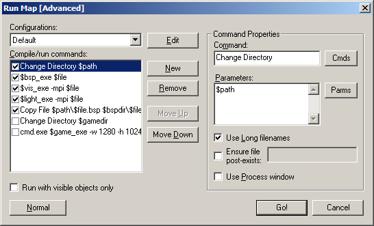 Note: Lorsque vous utilisez le mode de compilation normal, les fichiers .BSP (map du jeu compilées) sont copiées dans l'endroit spécifié dans le champ Place compiled maps in this directory before running the game. Si vous utilisez le mode expert, vous devez vous assurer que les maps sont copiées là-bas vous même en utilisant la variable $bspdir.