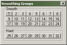 These are the Smooth Groups that the current face(s) are a member of. To add a face to a Smoothing Group, select the face, then depress the numbered button of a Smoothing Group. A face can be in multiple Smoothing Groups.