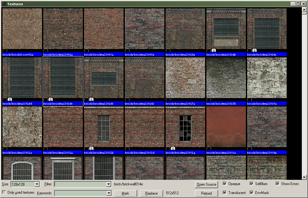 When selected, this sets the browser to display only those textures that have been used in your level. This helps you limit your use of different textures, and avoid using different textures for the same purpose. For games such as Half-Life, textures are stored in the compiled maps. Reducing the number of textures will decrease the compiled map size. Fewer textures to load also means memory savings while playing the map in the game.