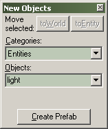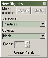 The New Objects Bar controls multiple facets of creation within Hammer. Entities, prefabs, brushes – the creation of all of these can be controlled from here. The options available in the New Objects Bar reflect the category of object you are creating or editing – primitives, entities, or prefabs.
