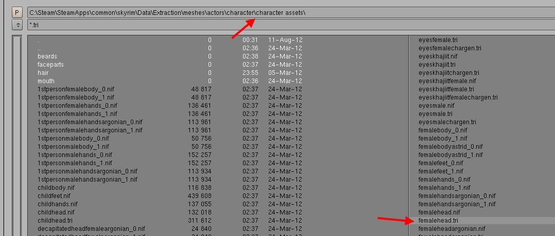 | Ci dessous on a l'adresse des fichiers TRI de la tête, ça se trouve dans meshes\actors\character\character assets\. on peut comme je l'ai fait extraire tous les fichiers originels dans un dossier séparé pour éviter de les mélanger à ceux des mods qui seraient installés. |