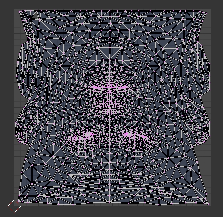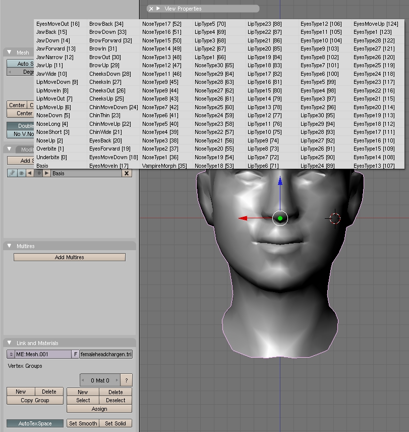 | On va remarquer que ce fichier est centré sur l'origine, qu'il possède un mappage UV pour pouvoir appliquer une texture pour mieux visaliser les expressions. On va remarquer aussi qu'il n'y a pas de Vertex Group, donc pas de liaison au squelette. C'est du au fait que les animations du visages ne sont pas générées par des os animés mais par un morphing (déformation) du modèle. |