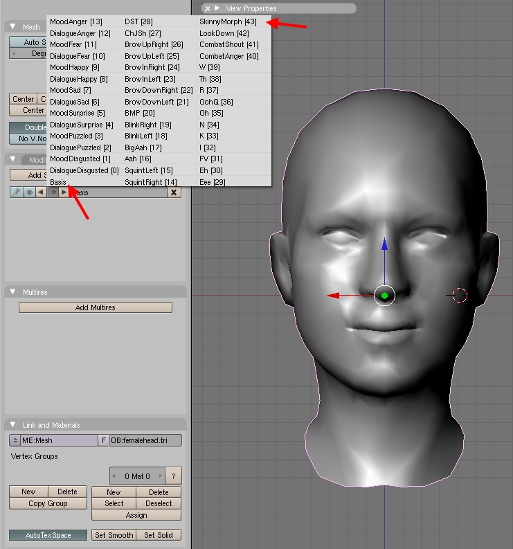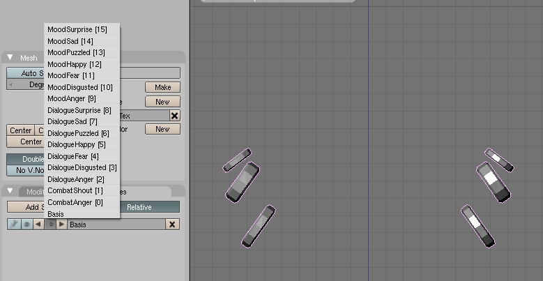 Avec ce plugin vous pouvez par exemple importer le fichier des animations du visage et les modifier à votre gout. Mais attention, vous de devez pas supprimer des sommets ni renommer les clés sinon ça ne marchera plus. Le fichier NIF et le fichier TRI sont une paire, il faut qu'ils aient les mêmes sommets et les clés doivent avoir le nom exact pour pouvoir être utilisées par le jeu. |