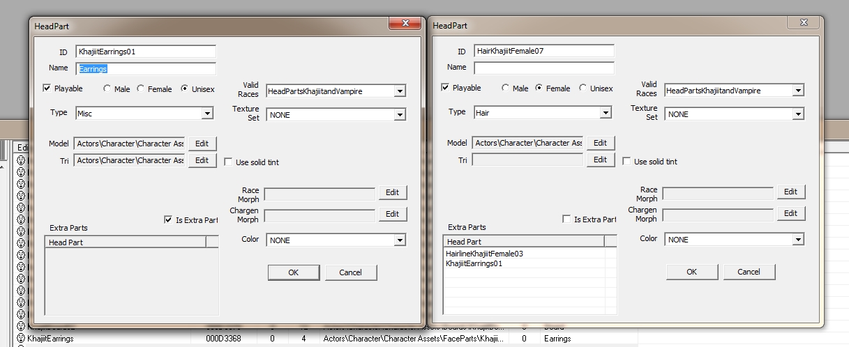 | Dans le cas ci-dessous qui concerne des anneaux pour les oreilles des khajiits, on voit qu'on a un modèle NIF et un modèle TRI principaux, celui qui concerne les animations du visage (en effet les oreilles des khajiits sont mobiles selon les expressions du visage comme chez les chats). |