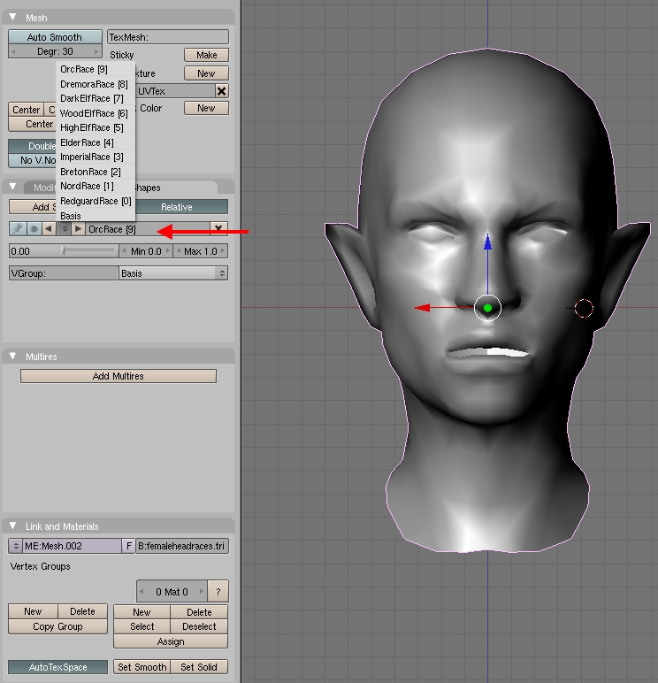 | Ensuite pour la race humaine on va avoir un deuxième fichier de morphing qui lui va contenir dans chaque clé la forme de la tête de chaque race, humains de divers types, elfes de divers type et orcs. |